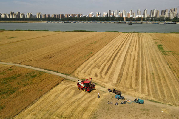 5月29日,在安徽蚌埠市五河縣朱頂鎮淮河岸邊,村民將收割的小麥裝車(無人機照片)。
