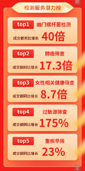 此外,肺癌篩查成交額同比增長超17倍,女性相關健康篩查成交額同比增長超8倍,就連被行業內公認不易取得突破的重疾早篩類項目,也取得23%的同比增長。