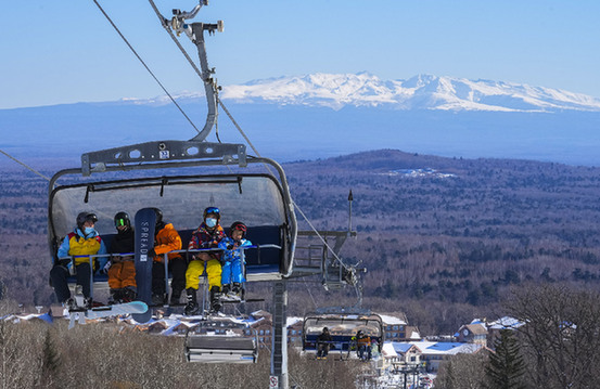 長白山西坡的萬達滑雪度假區內,雪友乘坐纜車上山?!∮浾摺≡S暢 攝