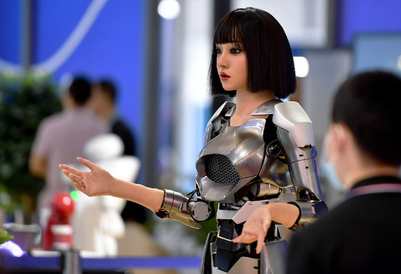 在第七屆數字中國建設峰會現場體驗區,超仿生人形機器人“小柒”在向觀眾致意?!⌒氯A社記者 魏培全 攝