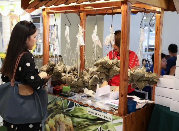 ??2019年6月2日,一名女子在泰國曼谷的一家酒店內購買粽子。新華社記者張可任攝