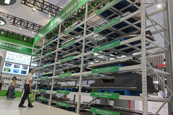 一家企業展示的回收的新能源汽車動力電池。資料照片