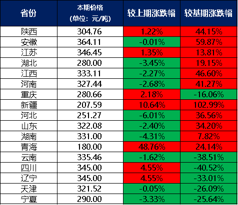 分價格區間來看,本期兩堿工業鹽單價在300元/噸及以上的地區有11個,是陜西、安徽、江蘇、江西、河南、山東、湖南、云南、四川、遼寧、天津;兩堿工業鹽單價在300元/噸以下的地區有6個,分別是湖北、重慶、新疆、河北、青海、寧夏。