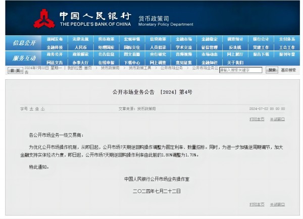 7月22日,央行發布公開市場業務公告,宣布即日起公開市場7天期逆回購操作采用固定利率、數量招標,操作利率由1.8%調整為1.7%。