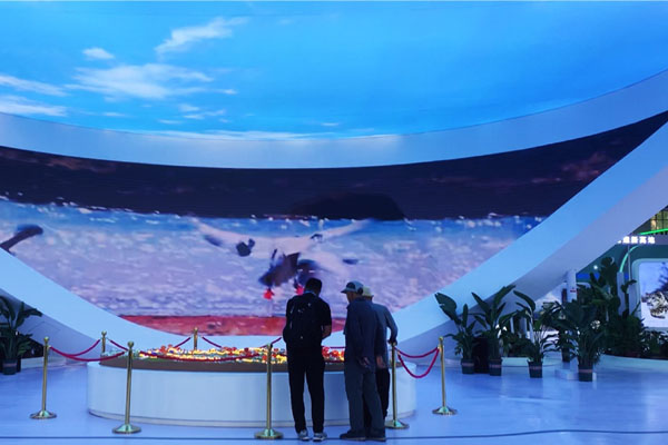 正如楊棟所說,青洽會現場最吸引人的是綠色發展館。記者在展館入口處的一個沙盤前看到,一根根白色風力發電桿點綴著綠草如茵的山坡,一塊塊光伏發電板拼成了“藍色海洋”,深山峽口處的抽水蓄能電站則更顯山勢的雄偉……大美青海的山川戈壁,在綠色成為發展主色調的今天,處處有新機。