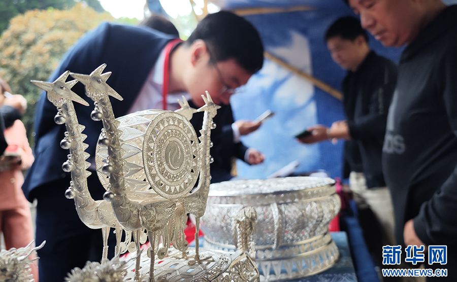 10月11日,參加茅臺酒節的嘉賓在茅臺中國酒文化城參觀苗族銀飾。新華網 盧志佳 攝
