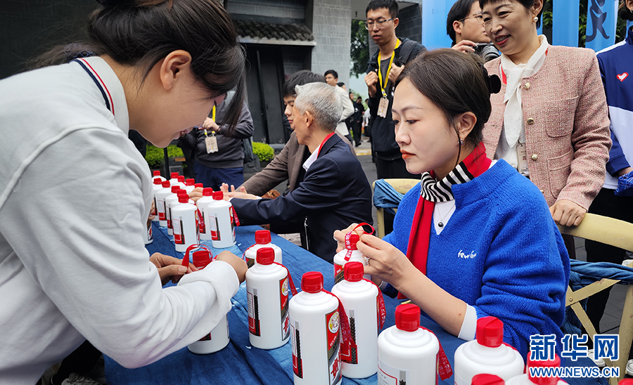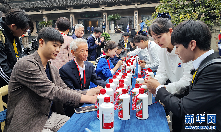 10月11日,參加茅臺酒節的嘉賓在茅臺中國酒文化城體驗茅臺栓絲帶。新華網 盧志佳 攝
