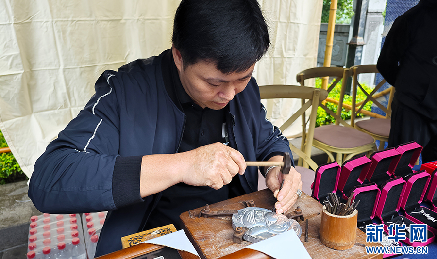 10月11日,貴州苗族銀飾非遺傳承人在茅臺酒節用銀鍛造茅臺“小茅”形象。新華網 盧志佳 攝