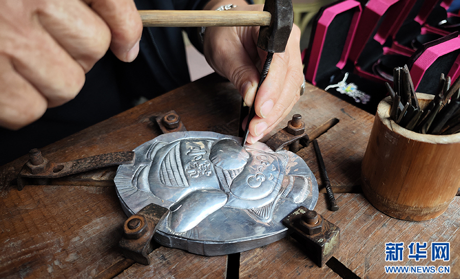 10月11日,貴州苗族銀飾非遺傳承人在茅臺酒節用銀鍛造茅臺“小茅”形象。新華網 盧志佳