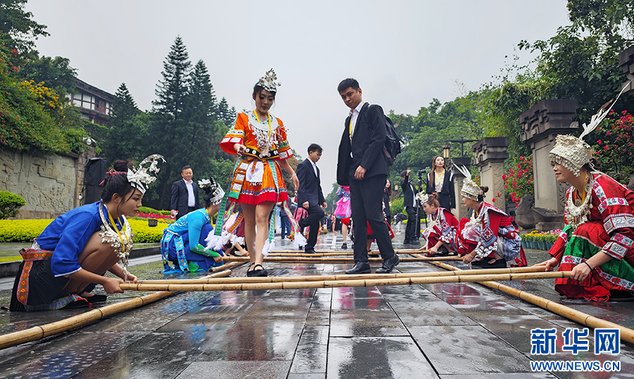 10月11日,參加茅臺酒節的嘉賓在茅臺中國酒文化城體驗竹竿舞。新華網 盧志佳 攝