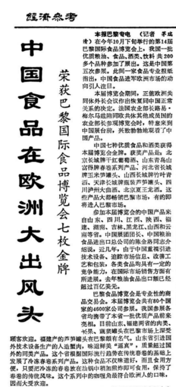 翻開1990年11月6日《經濟參考報》,標題為《中國食品在歐洲大出風頭》的文章,描寫了第14屆巴黎國際食品博覽會上,我國一批優質糧油、食品、酒類、飲料共200多個品種參加展出的場景。其中,中國七種優質食品和酒類獲得該屆博覽會金牌,瀘州老窖所生產的“四川瀘州大曲酒”位列其中,在國際舞臺上展示出中國風采。