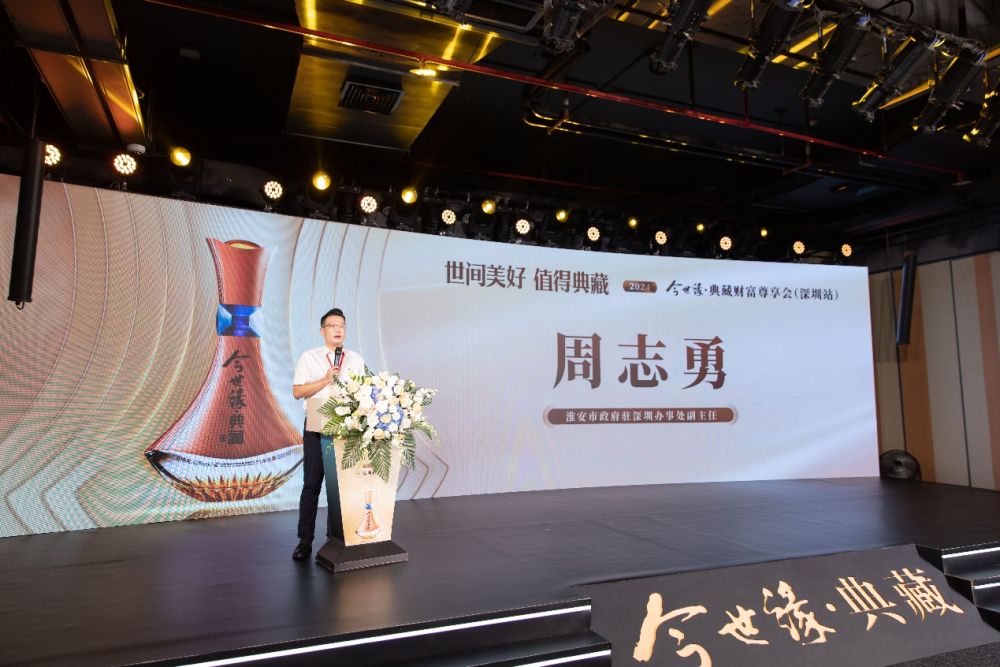 淮安市政府駐深圳辦事處副主任周志勇發表致辭。他說,江蘇淮安文化底蘊深厚,而今世緣酒業作為淮安的杰出代表,此次在深圳舉辦今世緣·典藏財富尊享會(深圳站),不僅體現了對深圳市場的重視,也彰顯了淮安與深圳之間日益密切的交流與合作。