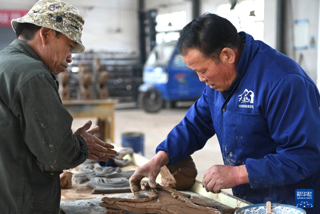 10月30日,在固原市隆德縣魏氏磚雕傳承基地,卜文?。ㄓ遥┰谏a車間對工人進行指導。