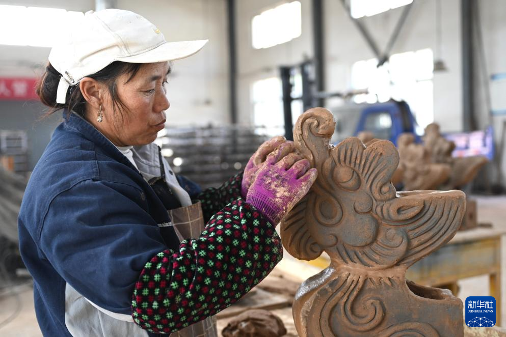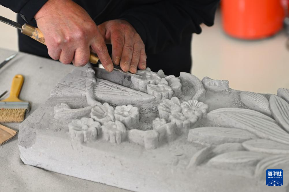 10月30日,在固原市隆德縣魏氏磚雕傳承基地,卜文俊在刷去磚雕作品上的磚灰。