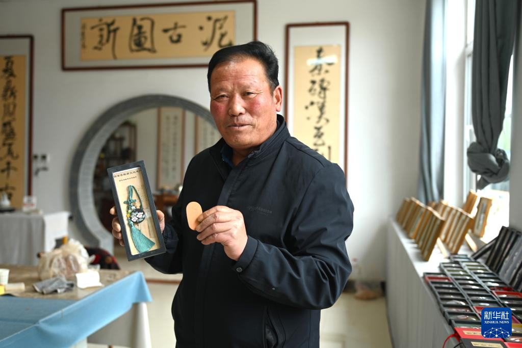 10月30日,在固原市隆德縣魏氏磚雕傳承基地,卜文俊在展示磚雕文創產品。