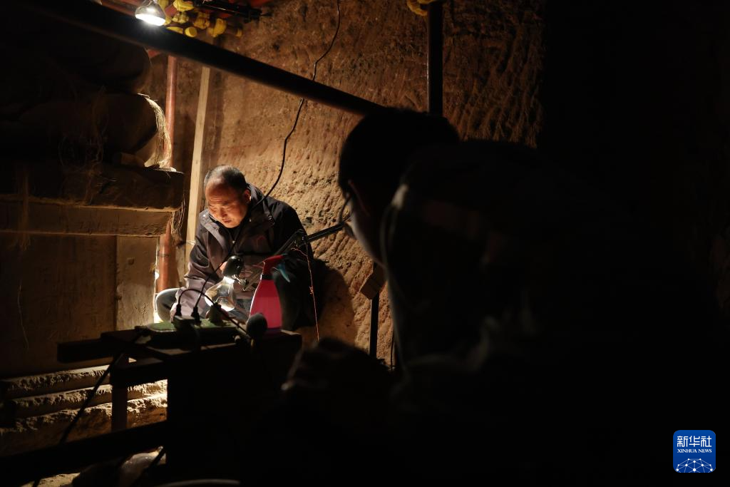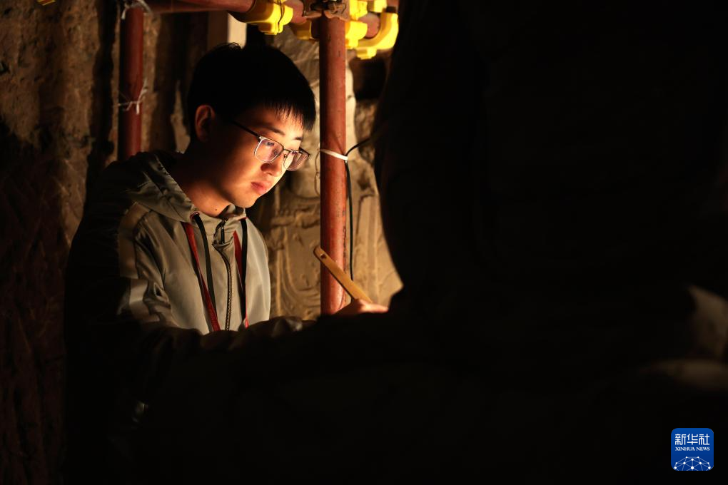麥積山石窟藝術研究所保護研究室文物修復師牟常有在麥積山石窟133窟內查看塑像(11月2日攝)。