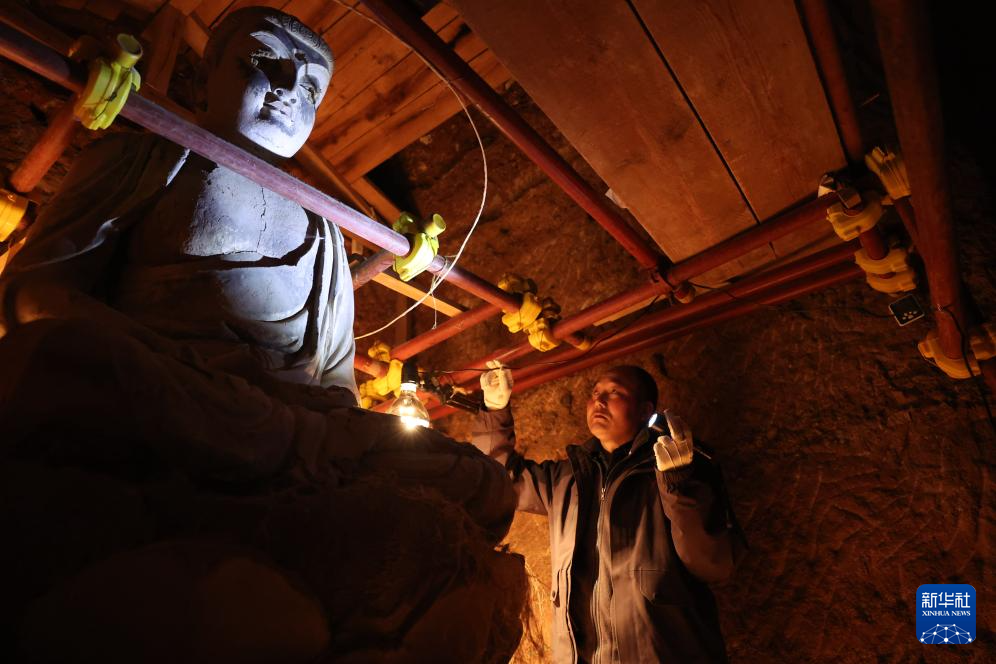 麥積山石窟藝術研究所保護研究室文物修復師何舉在麥積山石窟133窟內修復塑像(11月2日攝)。