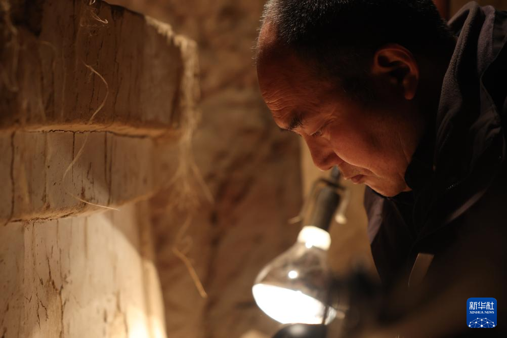 麥積山石窟藝術研究所文物修復人員楊志強在麥積山石窟32窟內進行保護修復工作(11月2日攝)。