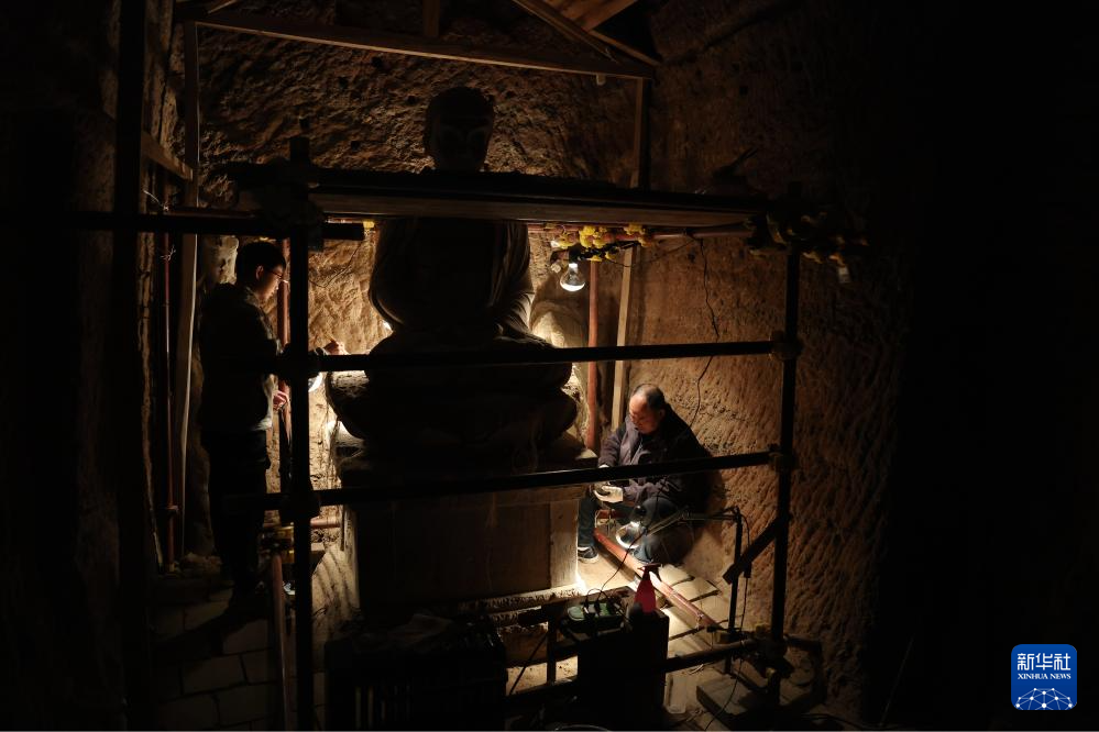 麥積山石窟藝術研究所保護研究室文物修復師牟常有(右)和何舉在麥積山石窟133窟內修復塑像(11月2日攝)。