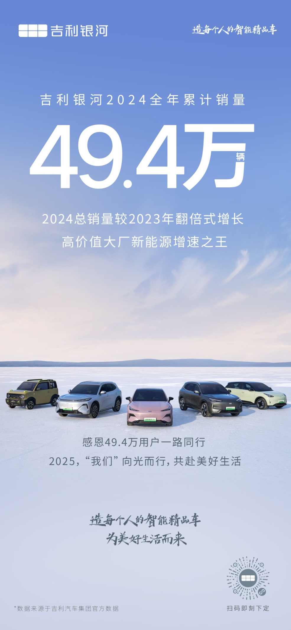 2025年,面對全新的經濟形勢和行業變革,吉利汽車集團將立足戰略轉型新階段,持續鉆研三電及智能化技術,依托電動化、智能化體系力優勢,為用戶提供更加安全智能的出行體驗,引領智能新能源汽車行業新方向。