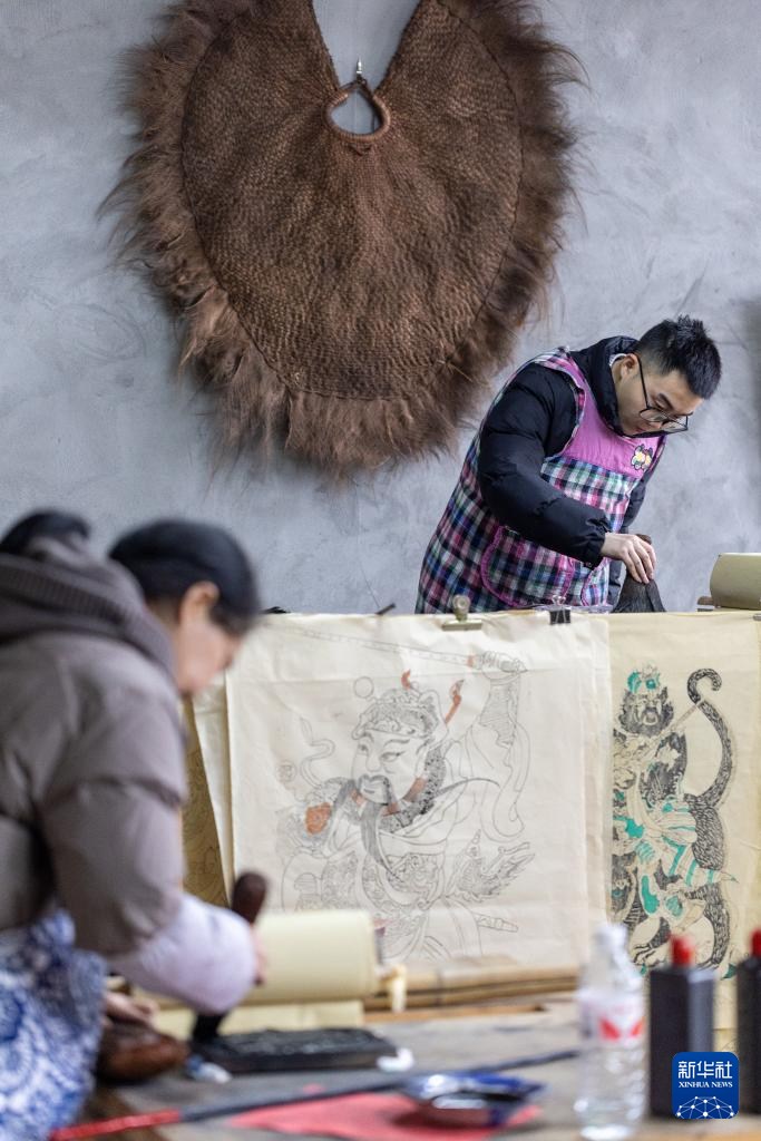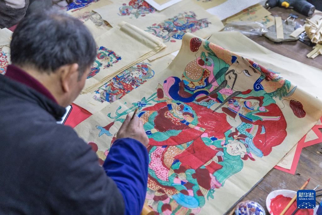 1月14日,在重慶市梁平區屏錦鎮,梁平木版年畫國家級代表性傳承人徐家輝在工作室內為年畫描色。