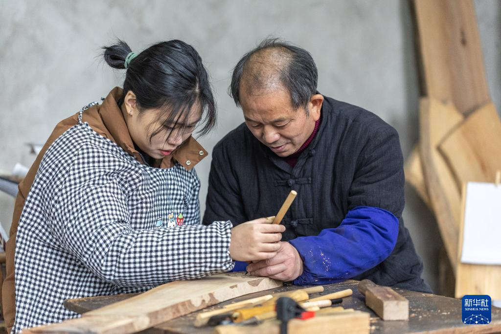 1月14日,在重慶市梁平區屏錦鎮,梁平木版年畫國家級代表性傳承人徐家輝(右)指導學生熊彩汝梁平木版年畫技藝。