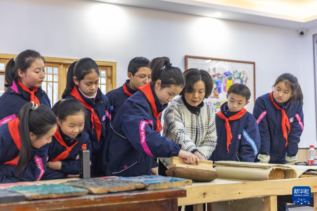 1月15日,在重慶市梁平區梁平實驗小學少兒年畫館,梁平木版年畫市級代表性傳承人莫紹萍指導學生們學習梁平木版年畫的刷印。
