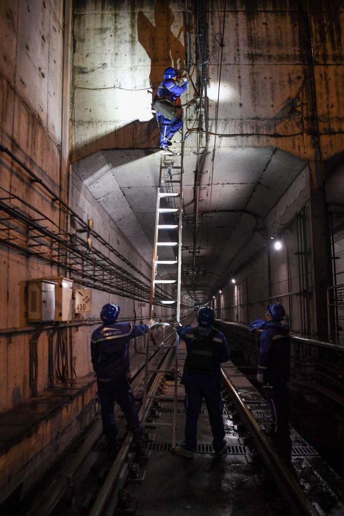 26日凌晨1時5分,在與車控室完成“清車”“停電”兩項工作對接并得到調度同意后,4人小組每人背著20多斤重的工具包,抬著5米長的梯子,下到地鐵隧道。