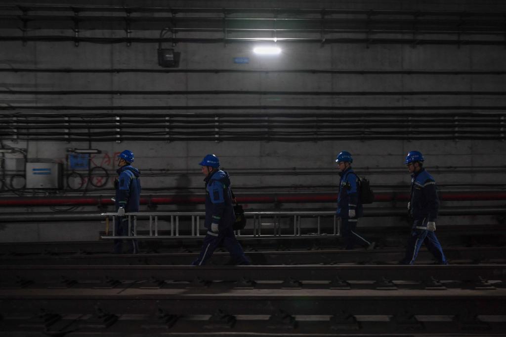 1月26日凌晨,成都地鐵北郊接觸網二班工作人員在一處地鐵隧道外更換避雷器。