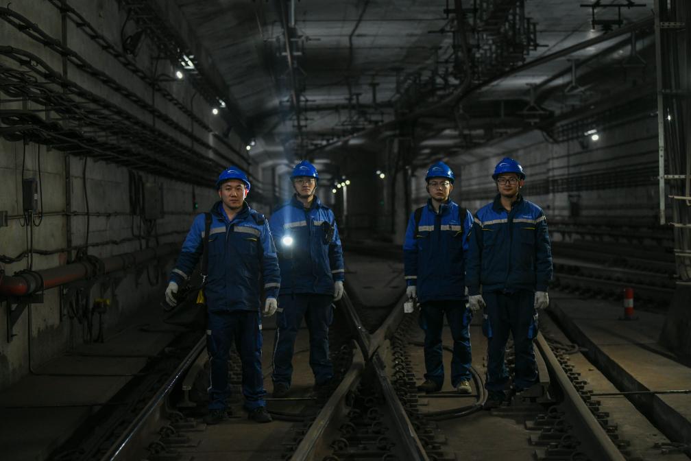 1月26日拍攝的成都地鐵北郊接觸網二班工作人員曾呂帥、王忠月、蔣俊偉和楊力(從左至右)。新華社記者 胥冰潔 攝