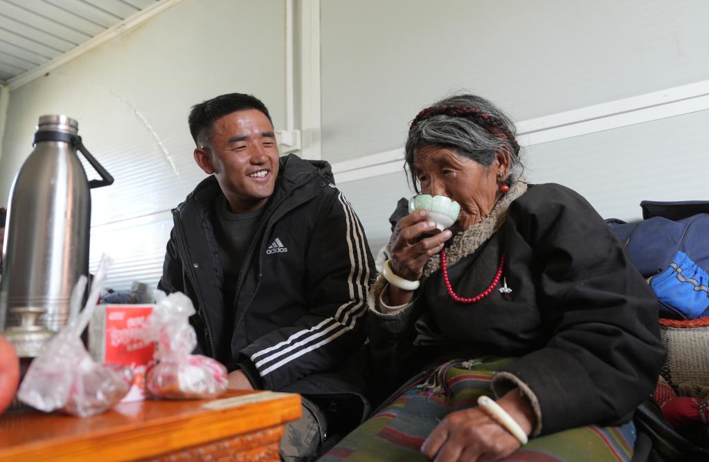 達娃次仁在救災帳篷見到了母親次仁塔覺。這位66歲的藏族老阿媽,身體硬朗,精神矍鑠,是全家人的“精神依靠”。