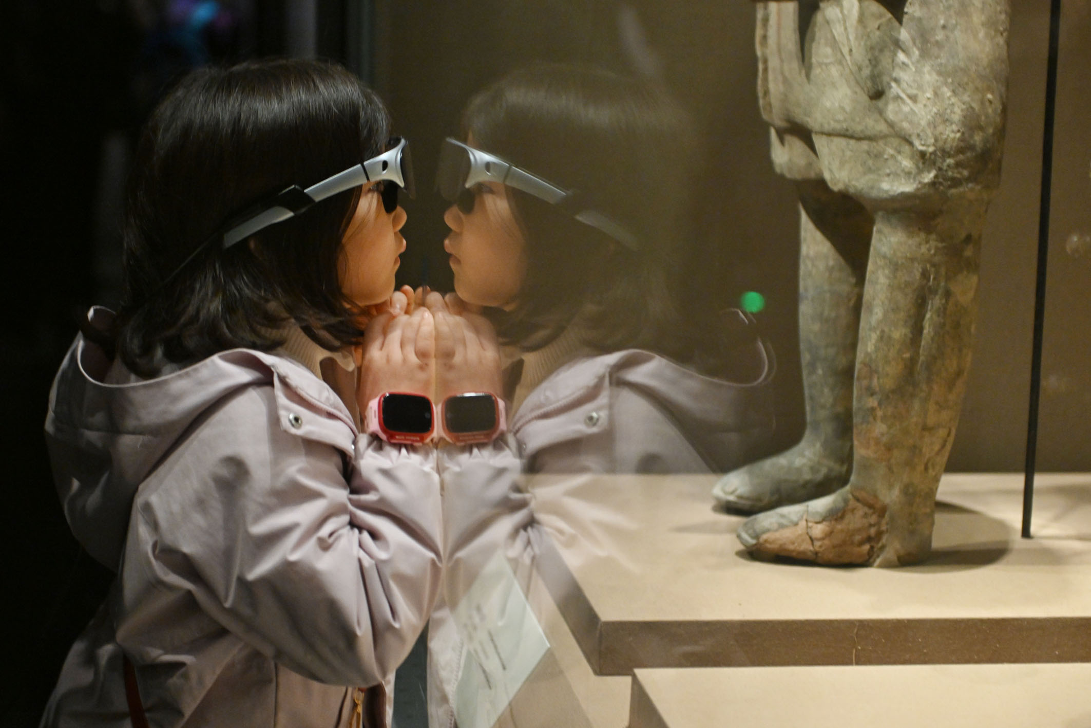 近日,在成都博物館,一名小朋友使用AR眼鏡智慧講解器參觀。春節假期,人們走出家門休閑游玩,享受假日時光?! ⌒氯A社記者 劉坤 攝