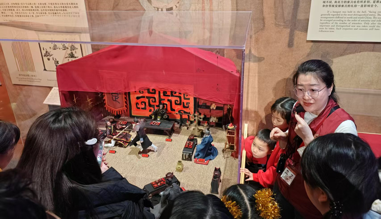 “范增作為項羽的謀臣,座次高于劉邦,這是不正常的?!痹谖挥谡褂[結尾的鴻門宴場景復原展位前,修宇為觀眾詳解其中座次排列相較當時禮制的異常之處,如何體現參加宴會雙方微妙的心理狀態。伴隨對種種細節的分析,展臺上的人物更顯栩栩如生,觀眾仿佛置身其中,從宴會禮儀的獨特角度再次品讀了家喻戶曉的鴻門宴故事。