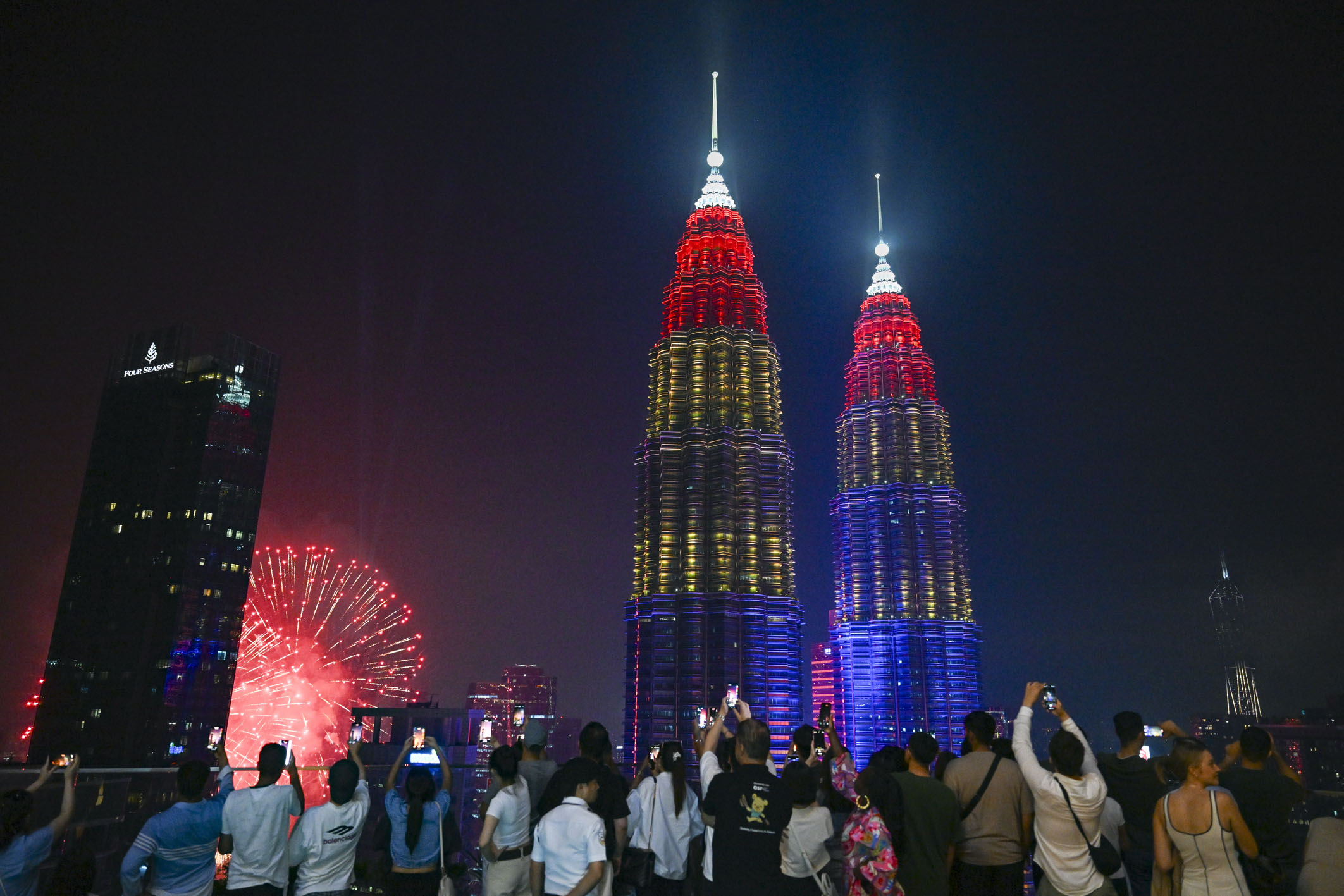 8月31日,在馬來西亞吉隆坡,人們在馬來西亞國家石油公司雙塔附近觀看焰火表演。