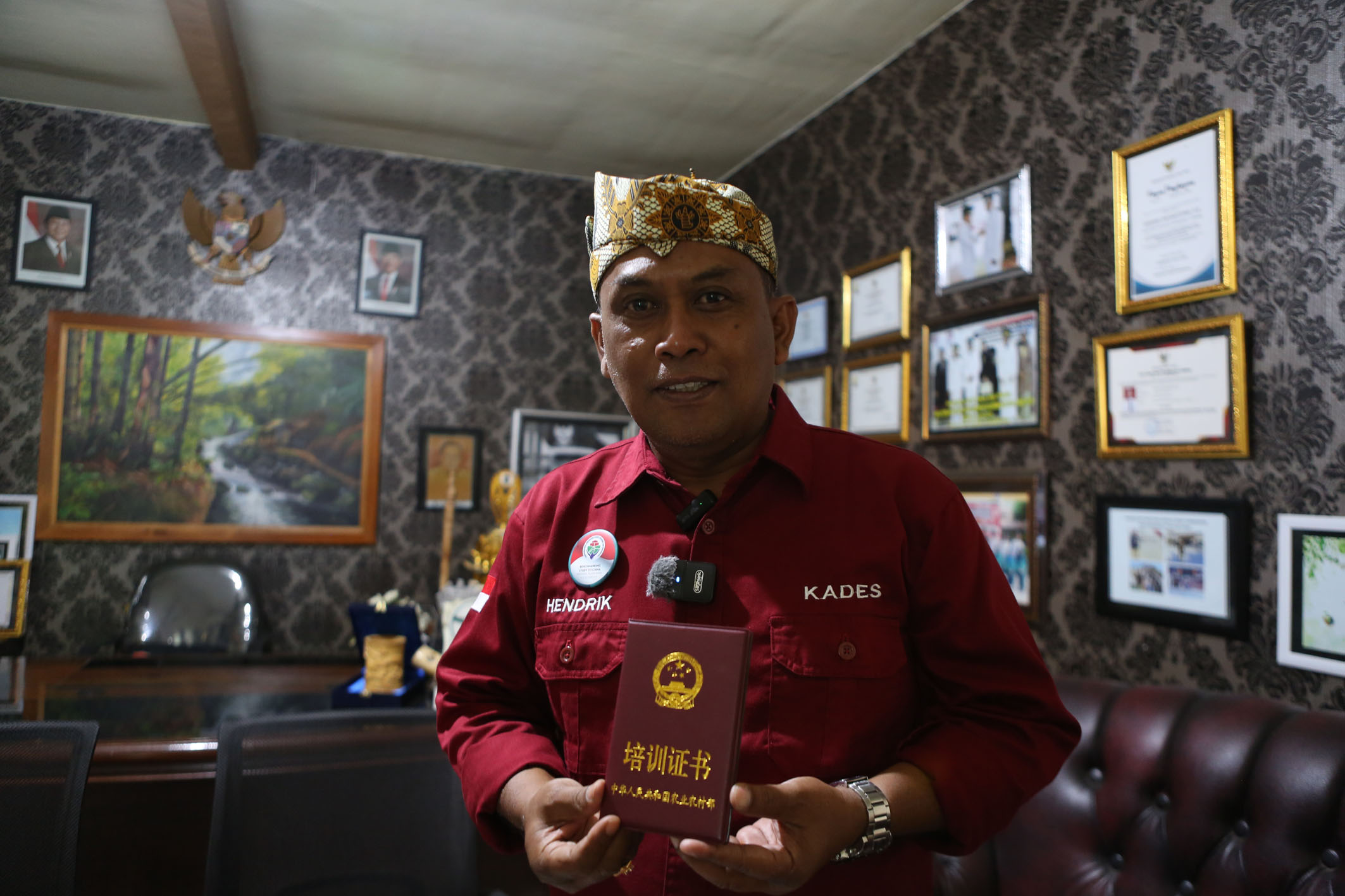 近日,在印度尼西亞爪哇島東部的布爾沃索諾村,村長亨德里克展示“村長班”培訓證書。