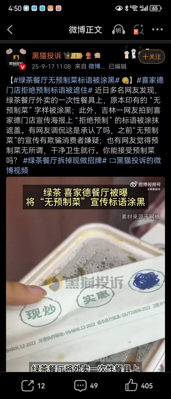近日,多名網友發現綠茶餐廳已經悄悄撤下了門店外“本店無預制菜,現點現做”的廣告語。9月17日,黑貓投訴官方微博發文稱,有多名網友發現,綠茶餐廳外賣的一次性餐具上,原本印有的“無預制菜”字樣已被涂黑。對此,有網友稱之前“無預制菜”的宣傳有欺騙消費者嫌疑。