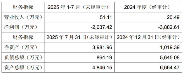 金字火腿稱,標的公司目前還未盈利,未來盈利狀況仍存在不確定性。財務數據顯示,2024年、2025年1至7月,中晟微分別實現營業收入20.49萬元、51.11萬元;凈利潤分別為-3882.61萬元、-2037.42萬元。