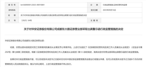 另一條行政監管措施顯示,成都東大路證券營業部因未按規定對員工在職期間的廉潔從業情況予以考察評估,四川證監局決定對該營業部采取出具警示函的行政監管措施。