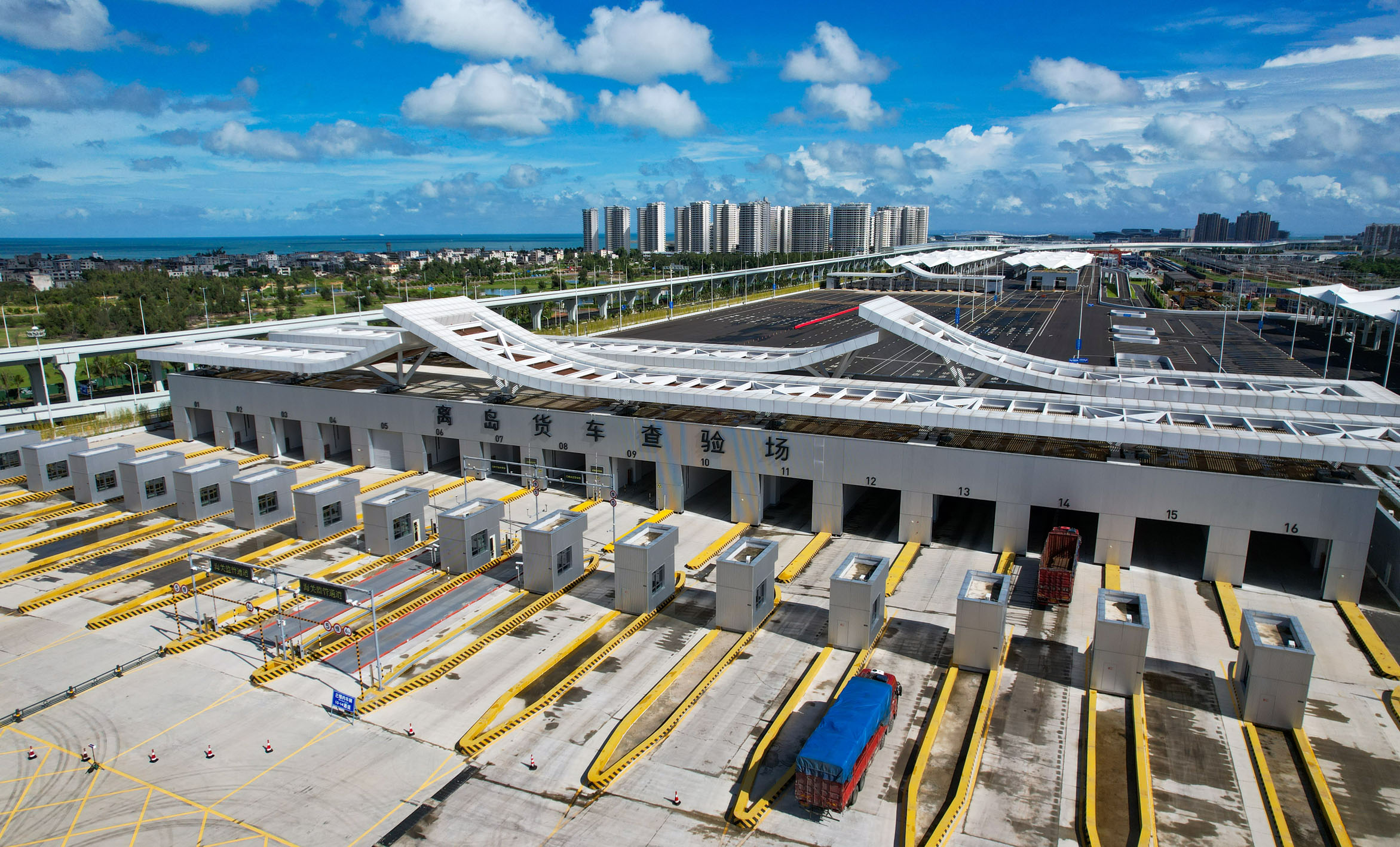 9月17日,離島貨車通過已正式試運行的??谛潞8酆湍细邸岸€口岸”(貨運)集中查驗場,開往港區(無人機照片)。根據海南自由貿易港封關運作相關工作安排,自9月15日起,該集中查驗場作為新海港和南港貨車的統一出島通道。