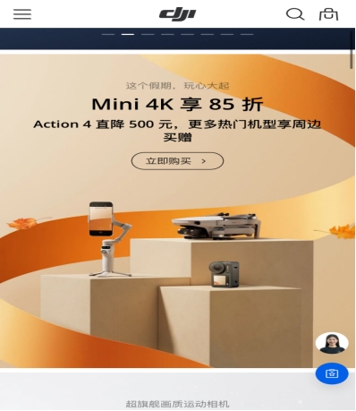 記者注意到,10月9日上午大疆官網首頁顯示有“Mini4K享85折 Action 4直降500元,更多熱門機型享周邊買贈”的活動信息。而當日下午記者再次瀏覽,已不見該活動信息。
