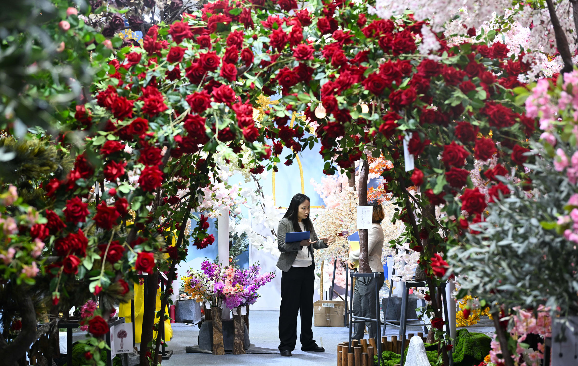圖為工作人員在仿真花展臺洽談。新華社記者 鄧華 攝