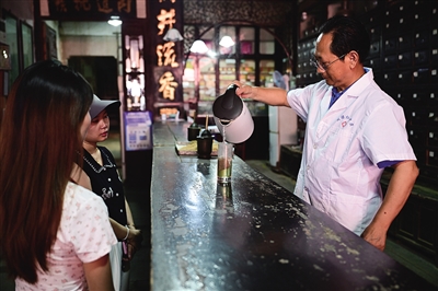在位于黃山市屯溪區的同德仁藥店,坐診醫師為游客制作藥茶。新華社記者 周牧 攝