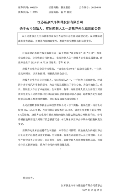 10月27日,新泉股份發布公告稱,公司收到公司創始人、實際控制人之一唐敖齊的家屬通知,唐敖齊于2025年10月26日逝世,享年80歲。
