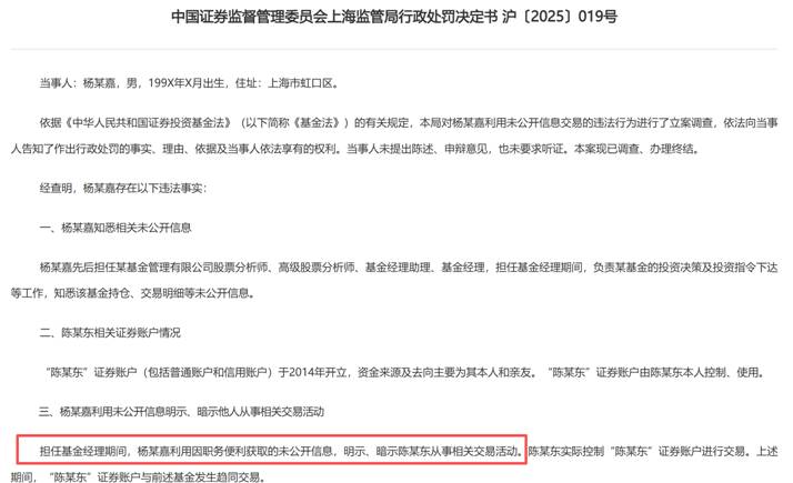 日前,上海監管局的行政處罰決定書顯示,在擔任基金經理期間,楊某嘉利用因職務便利獲取的未公開信息,明示、暗示陳某東從事相關交易活動。