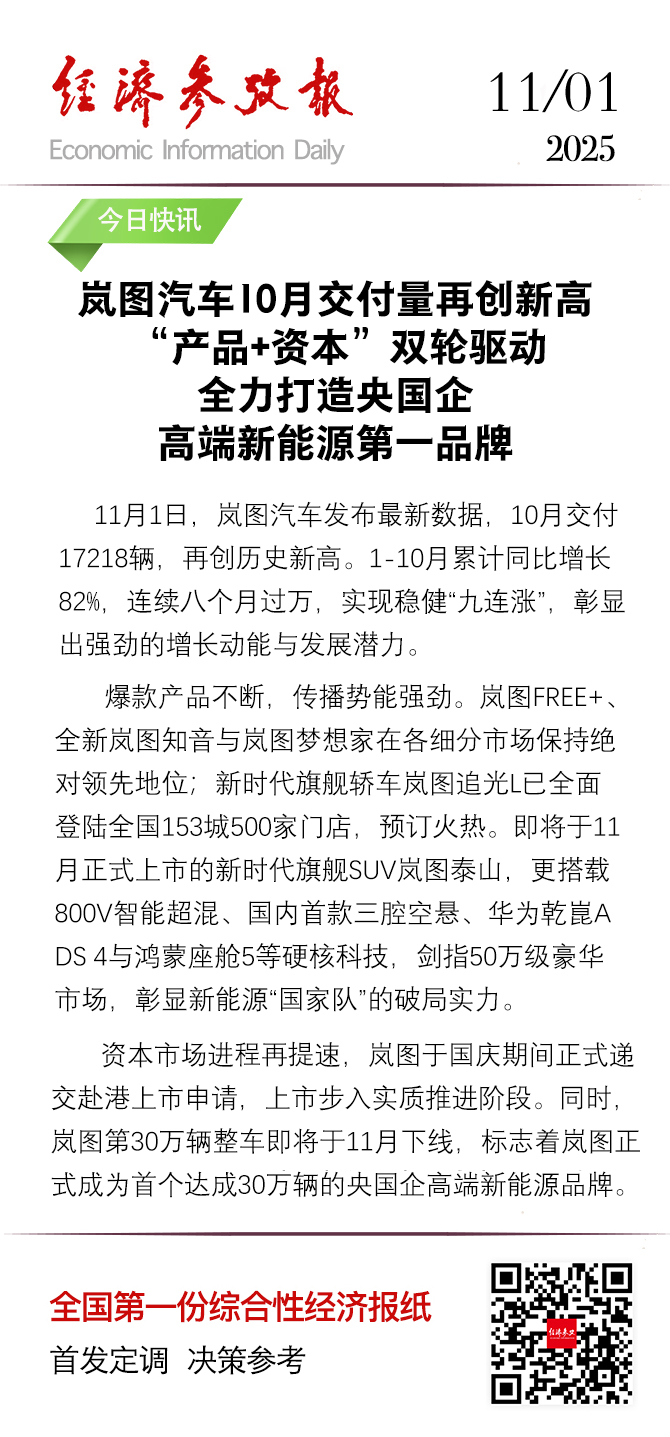 資本市場進程再提速,嵐圖于國慶期間正式遞交赴港上市申請,上市步入實質推進階段。同時,嵐圖第30萬輛整車即將于11月下線,標志著嵐圖正式成為首個達成30萬輛的央國企高端新能源品牌。(劉璐璐)