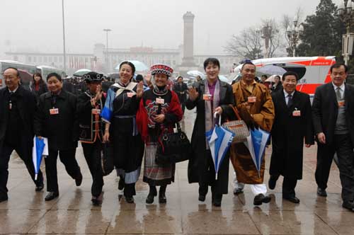 3月3日15時,中國人民政治協商會議第十屆全國委員會第五次會議在北京人民大會堂開幕。這是全國政協委員在北京的春雨中走向人民大會堂。
