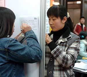 3月11日,在山西省煤炭博物館內,兩名大學生填寫求職履歷表。當日,一場大型人才招聘會在山西省煤炭博物館內舉行,近500家用人單位提供崗位1萬余個,吸引了2萬余名求職者,其中,多數求職者都是高校應屆畢業生。本報記者 燕雁 攝