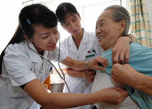 如何讓老百姓盡量少花錢看好?陳海嘯代表認為,除提高醫務人員技術水平和從醫道德,規范醫院發展方向、促進醫療體制改革,實行醫藥分家等措施外,還應制定一個作為行醫治病標準的疾病診療指南。 圖為沈陽市和平區新興社區衛生服務中心大夫杜雪梅(左)和馬荏秋(中)在為夏春英老人檢查身體(資料照片)。