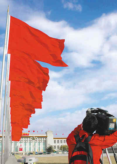 3月2日,北京天安門廣場到處紅旗飄揚。一位記者在廣場拍攝。陳志剛