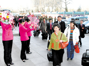出席十一屆全國人大一次會議的上海代表3月2日下午抵達北京住地京西賓館時受到歡迎。記者 郭天中 攝 |